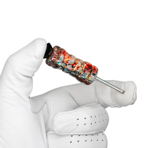 This handcrafted golf divot tool is a one-of-a-kind piece. Each is turned on a lathe in Tennessee by our friend Trevor Tucker at TTucks Golf Shop. These are made of Alumilite resin, and feature a brush at one end and a tip specially honed to clean the grooves of your irons.